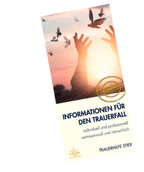 Unser Flyer „Informationen für den Trauerfall“ gibt Ihnen eine Übersicht über die ersten Schritte und wichtigen Dokumente.